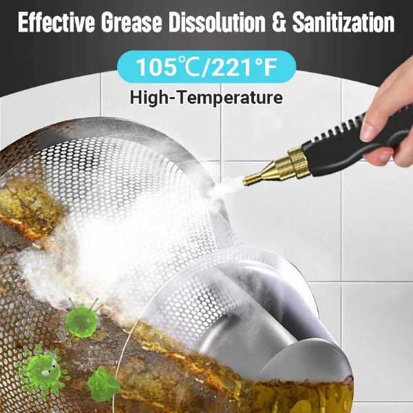 Nazivna snaga od 2500W stvara paru do 105℃ za manje od 10 sekundi, uklanjajući masnoću, prljavštinu, prašinu i mrlje sa različitih površina brzo i efikasno.