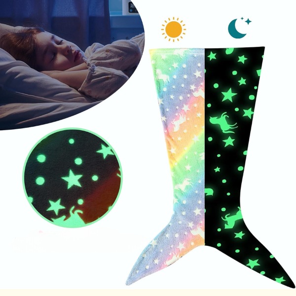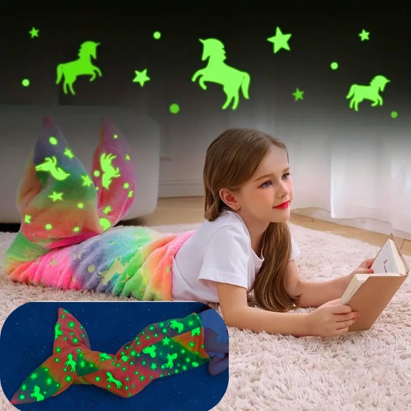 Prekrivač MERMAIDREAM sija u mraku, pružajući umirujuće svetlo za ublažavanje noćnih strahova. Jednostavno ga izložite dnevnom svetlu na 20 minuta i on će tiho svetleti cele noći. Odaberite dizajn repa ajkule ili repa sirene za dodatnu magiju dok vaše dete spava.