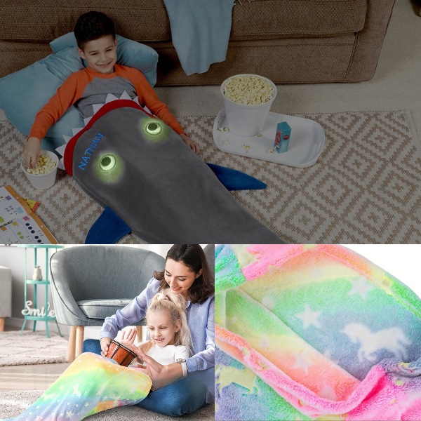 Mekani, visokokvalitetni flanelski flis zagreva decu dok se opuštaju posle škole ili opuštaju tokom noći. Savršen je da se zavalite na kauču dok gledate crtane filmove ili da vam bude toplo tokom hladnih noći. Vaša deca će se smejati od radosti dok se sklupčaju u repu ajkule ili sirene.