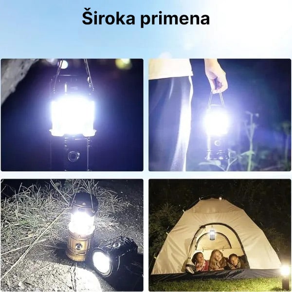 Ova izvanredna baterijska lampa+svetiljka pogodna je za širok spektar aktivnosti. Koristite je tokom pecanja, planinarenja, lova ili jednostavno za opuštanje u vrtu. Robusna ručka lampe omogućava da se prikači bilo gde, pružajući osvetljenje bez ruku. Njegov kompaktni i lagani dizajn olakšava nošenje i skladištenje, čineći je savršenom za sve avanture na otvorenom i zatvorenom.
